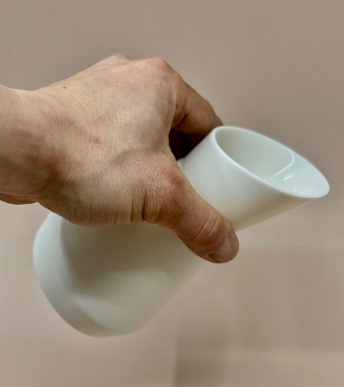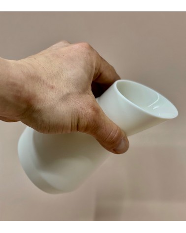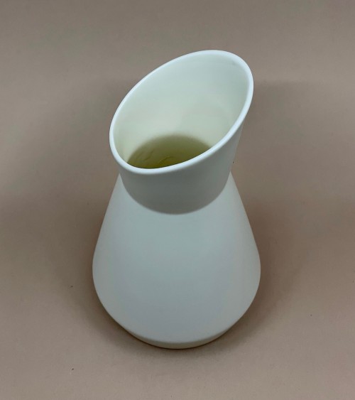 Porcelain milk jug. Glossy glaze on the inside, sanded on the outside and not glazed.